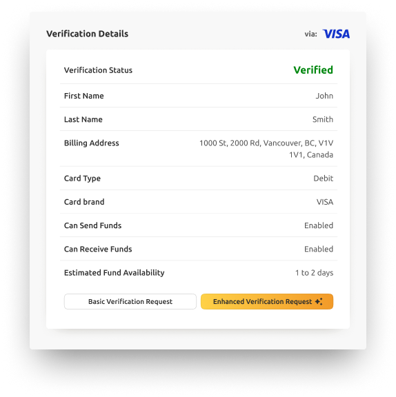 Enhanced verification provides full cardholder details, including card type, product category, eligibility for transfers, and risk indicators. This helps you detect fraud and assess card legitimacy before processing payments.
