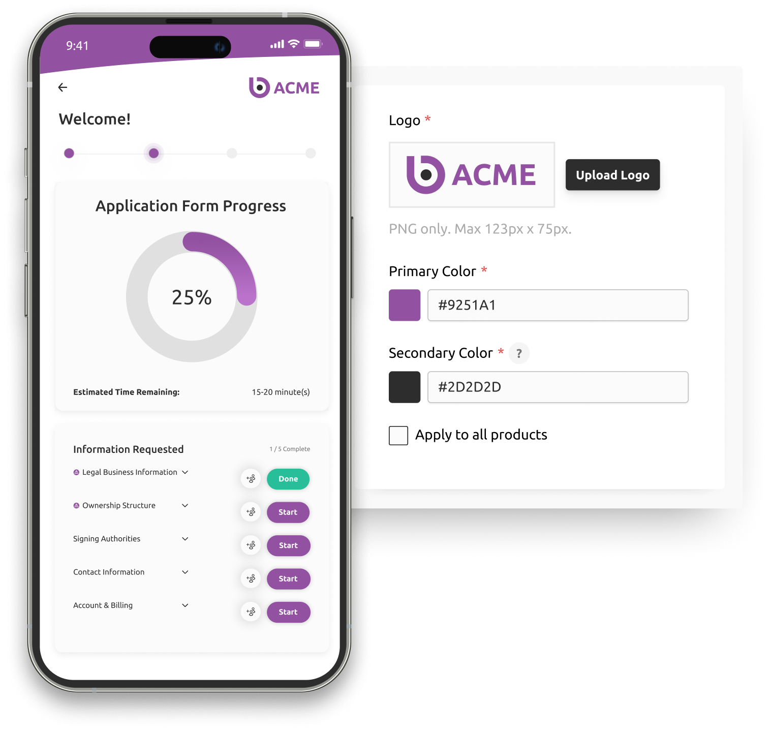 Use our white-label toolkit to brand and personalize the onboarding application experience for your users, ensuring brand integrity at every step of the process.