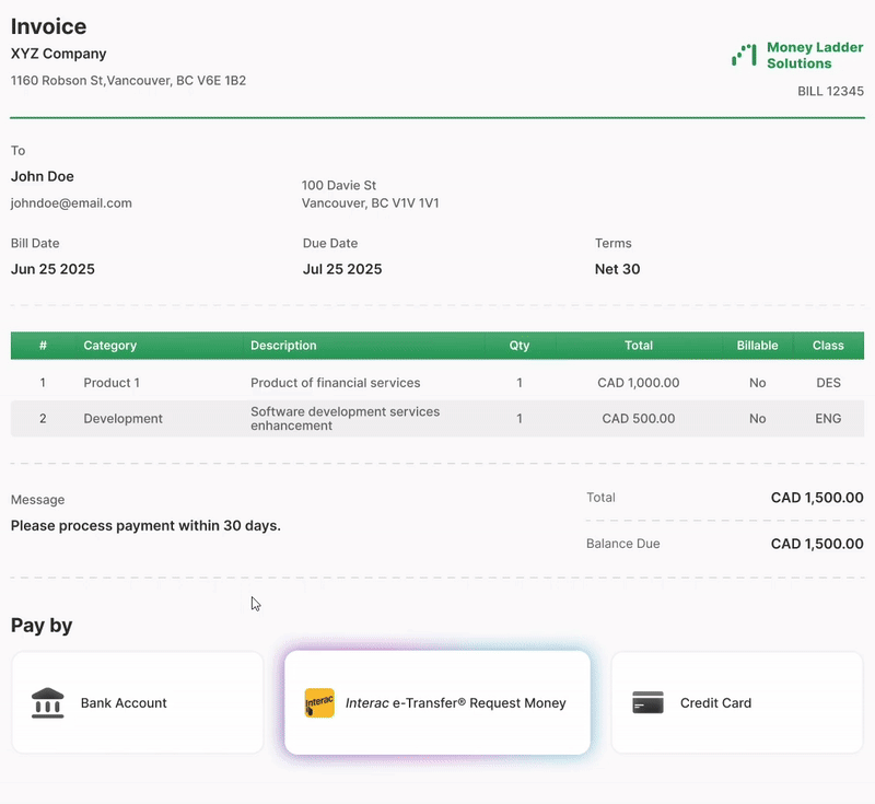 Embed Interac e-Transfer® Request Money directly into your invoices, website, or platform, allowing customers to complete payments without leaving your site for a fully integrated payment experience.