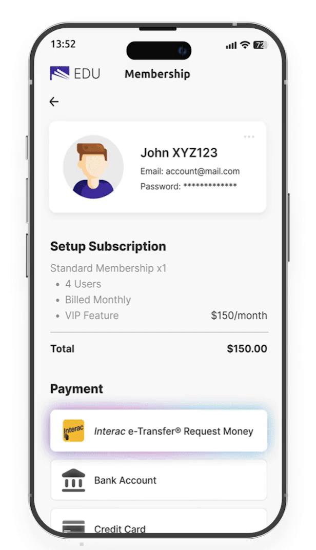 Embed Interac e-Transfer® Request Money directly into your subscription platform or app to make recurring and one-time payments effortless. Whether you manage gym memberships, online courses, or app subscriptions, customers can approve payments right where they interact with your service, no redirects or manual entry.